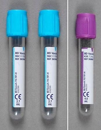 respectievelijk 2 citraatbuizen 2,7 ml met lichtblauwe dop en 1 EDTA-buis 4 ml met paarse dop